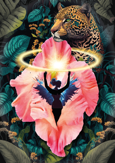 Digital collage artwork honouring the fierce, radiant power of the feminine in all her wild, untamed beauty.